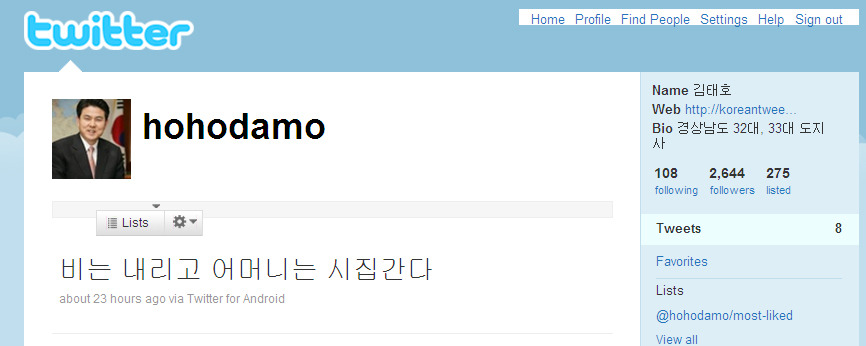 결국! 김태호 총리후보가 낙마했다. 40대 기수론으로 호기롭게 출발했다가 결국 높은 도덕적 잣대를 통과하지 못한 셈이다. 다행이다. 앞으론 총리/장관될 사람에게 어떤 기준을 제시한 셈이니 말이다. 그런데는 사실 누가 총리되든 관심 별로 없었다. 전임 정 총리도 그랬듯이 우리나라에선 누가 총리가 되던 대통령제 밑에서 얼굴마담 말고는 무슨 권한이 없는 것 아닌가. 대신, 김태호 후보가 사퇴를 선언한 후 자신의 트위터에 올렸다는 글에 더 관심이 갔다. 그는 자신의 트위터에 이런 글을 남겼다.