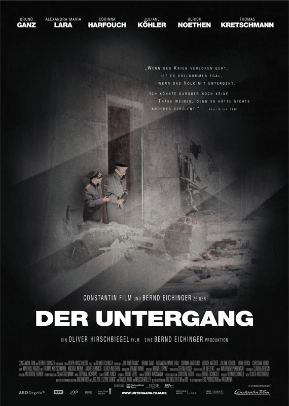 (박재환 2010-12-30) 올해 초였던가? 인터넷에 재밌는 동영상이 나돌았다. 웬 독일어 영화인데 벙커에서 히틀러가 부하들과 함께 심각하게 작전회의를 하는 영상에 자막은 엉뚱하게 한국 MB정권의 4대강을 심하게 조롱하는 내용이었다. 히스테리 컬한 히틀러의 얼굴표정과 함께 기막힌 한글 자막은 순식간에 인기 동영상이 되었다. 보면서 참 감탄했었다. 이런 패러디는 20여 년 전 ‘장진’ 감독이 한 TV코미디 프로에서 <바람과 함께 사라지다>를 자연재난영화라며 천연덕스럽게 패러디한 것을 본 이래 최고로 완벽한 작품이었다. 유튜브 찾아보니 그 히틀러 동영상에 자막 넣어 패러디 쇼를 하는 건 우리나라만이 아니었다. 미국에서도 수많은 ‘작품’이 있었다. 정치적인 것이 아니라 이런 것들이다. “뭐라고? 해리 포터가 우리 동네에선 상영을 안 하다고? (지도를 가리키며…) 여기여기도 하는데….” 식으로. 각종 게임, 영화가 그런 식으로 히틀러의 입을 통해, 그리고 말도 안 되는 자막을 통해 네티즌을 즐겁게 하였다. 그 원소스가 된 동영상이 궁금했었다. 그 영상은 독일 콘스탄틴 영화사의 <몰락>(Der Untergang)이란 2005년 작품이다. 이 영화는 아카데미 외국어영화상 후보에 올랐었다. (상은 스페인의 <씨 인사이드>에 돌아갔다) 그 영화를 보고, 책을 읽고, 관련 다큐를 다 보고 지금 글 쓴다.