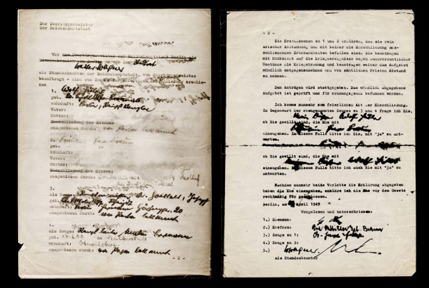 4월 29일. 히틀러는 뜻밖의 행동을 보여준다. 연인 에바 브라운과 결혼식을 올린다. 사실혼관계였던 에바 브라운의 존재는 당시 외부에는 철저한 비밀이었다. (마치 김정일의 와이프가 누군지, 공식사진은 있는지… 와 마찬가지로) 히틀러는 죽기 전에 정식으로 가족을 이루고 싶었던 모양이다. 서둘러 호적사무소 관계자를 찾았고 정식으로 혼인서약을 한다. 그 서류는 아직도 남아있다. 당시 히틀러는 56세, 에바 브라운은 23살 어린 33세 이었다. 그의 결혼식, 아니 결혼서약 장소는 그들이 최후를 맞이했던 바로 그 지하벙커였고, 그의 핵심참모 대여섯 명이 현장을 지켜봤다. 지금은 히틀러의 기록필름, 다큐멘터리에서 에바 브라운의 모습을 쉽게 볼 수 있지만 당시 일반 대중에게는 에바 브라운은 미스터리 그 자체였을 것이다.