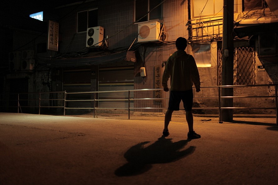 왜, 숫청년 영건은 밤에만 배회할까. 외계인이 밤에만 출몰하여? 아니, 지나가는 사람 안 걸리게 서울시내를 맘껏 찍을 수 있는 것은 그 시간대뿐이니. 조명(+발전차량) 동원할 돈이 없다. 그러니 자연스레 서울시내 가로등 밑에서 ‘자연’조명으로 영화를 대부분 찍는다. 다행히 <남격>촬영팀이 오니 그 덕분에 병원 옥상 씬도 찍을 수가 있는 것이다.