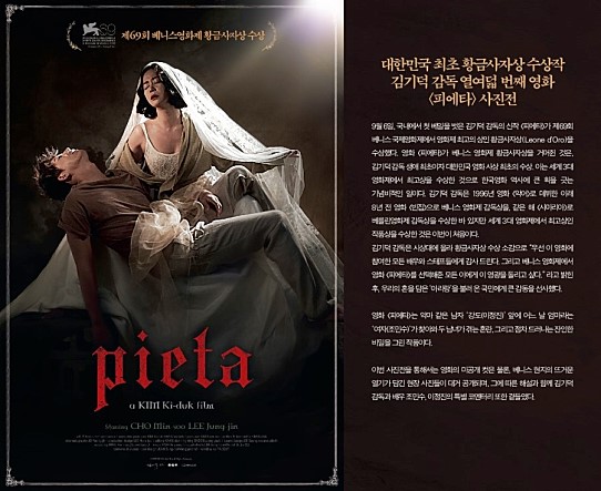 김기덕 감독이 베니스국제영화제에서 황금사자상을 탄 것은 어느 정도 예견된 일이다. <피에타>는 김기덕 감독의 18번째 작품이다. 그동안 그는 수많은 영화제로부터 콜을 받았고 수많은 평론가들로부터 한번쯤은 ‘물어 뜯김’을 당하였다. 그런데 상을 타고 나니 김기덕 감독을 더 이상 물어뜯기는 어렵게 된 모양이다. 상찬하기에 바쁘니 말이다. <피에타>는 이른바 ‘김기덕스런 영화’에서 가장 세련되고, 가장 유려하고, 가장 종교적인 해독이 가능한 영화이다. 물론, 나머지는 똑같다. (당연한 이야기겠지만) 출연배우들은 여전히 감독의 설정과 가이드라인에 주눅이 들어 갇힌 연기와 제한된 몸짓으로 완벽하게 캐릭터에 빙의되었고 소재는 여전히 잔인하거나 충격적이다. 이야기하고자하는 바는 보여주는 것 이상으로 해석의 공간이 많다.