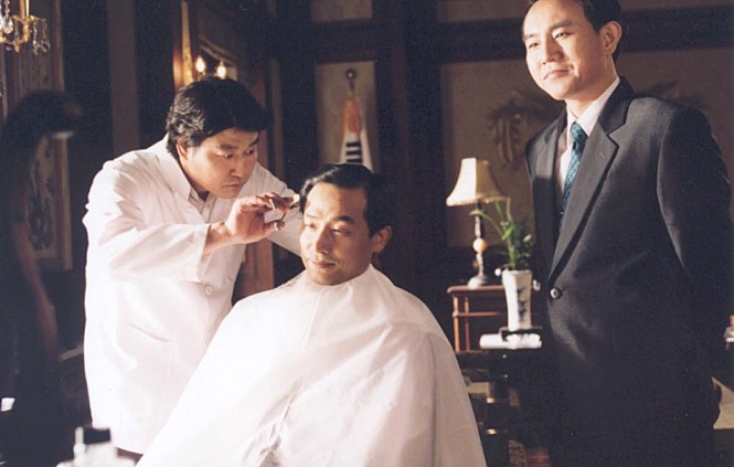 초반부에 '사사오입'이야기와 청와대에 이발사로 들어가기까지의 과정은 솔직히 연출과잉이라는 느낌이 들었다. 코믹적 요소가 오히려 떨어진다. 아, 신인감독이 의욕과잉으로 재밌는 이야기를 재미없게 풀어 나가구나 안타깝게 생각했는데 그런데... 정말 말도 안 되는 김신조 일당 에피소드가 시작되면서 영화는 급속하게 긴장감을 높인다. 김신조 일당이 퍼뜨렸다는 '마루구스' 설사병에 대한 이야기는 이 영화를 [지구를 지켜라] 이상의 컬트로 만들 것이 분명하다. 그것은 [신체강탈자의 침입] 이후 이데올로기의 침투에 대한 공포와 AIDS확산전염의 공포가 동급으로 취급되는 동시대적 위기감을 보여준다. 물론 독재권력을 유지하기 위한 술수이지만... 특히 어린 아들 '낙안이'가 남산지하실로 잡혀가서 전기고문 당하는 장면은 이 영화를 판타스틱 걸작으로 만들기에 족하다. [델리카트슨]을 능가한다. 혀 짧은 고문관의 우스운 행동은 유신독재시절의 비정상적 국가권력기관의 하수인과 그 시절을 살았던 처참한 민중의 일그러진 모습을 정말 '영화예술적'으로 승화시킨 명장면 중의 명장면이다.