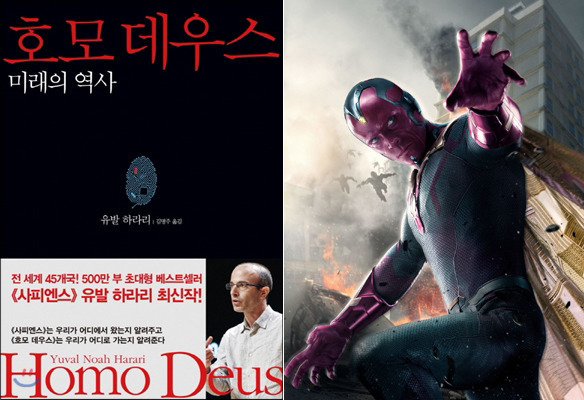 [사진: 호모데우스 표지(김영사)/ 어벤저스 에이지 오브 울트론(마블) <호모데우스 미래의 역사> 유발 하라리 지음/ 김명주 옮김 김영사 출판]