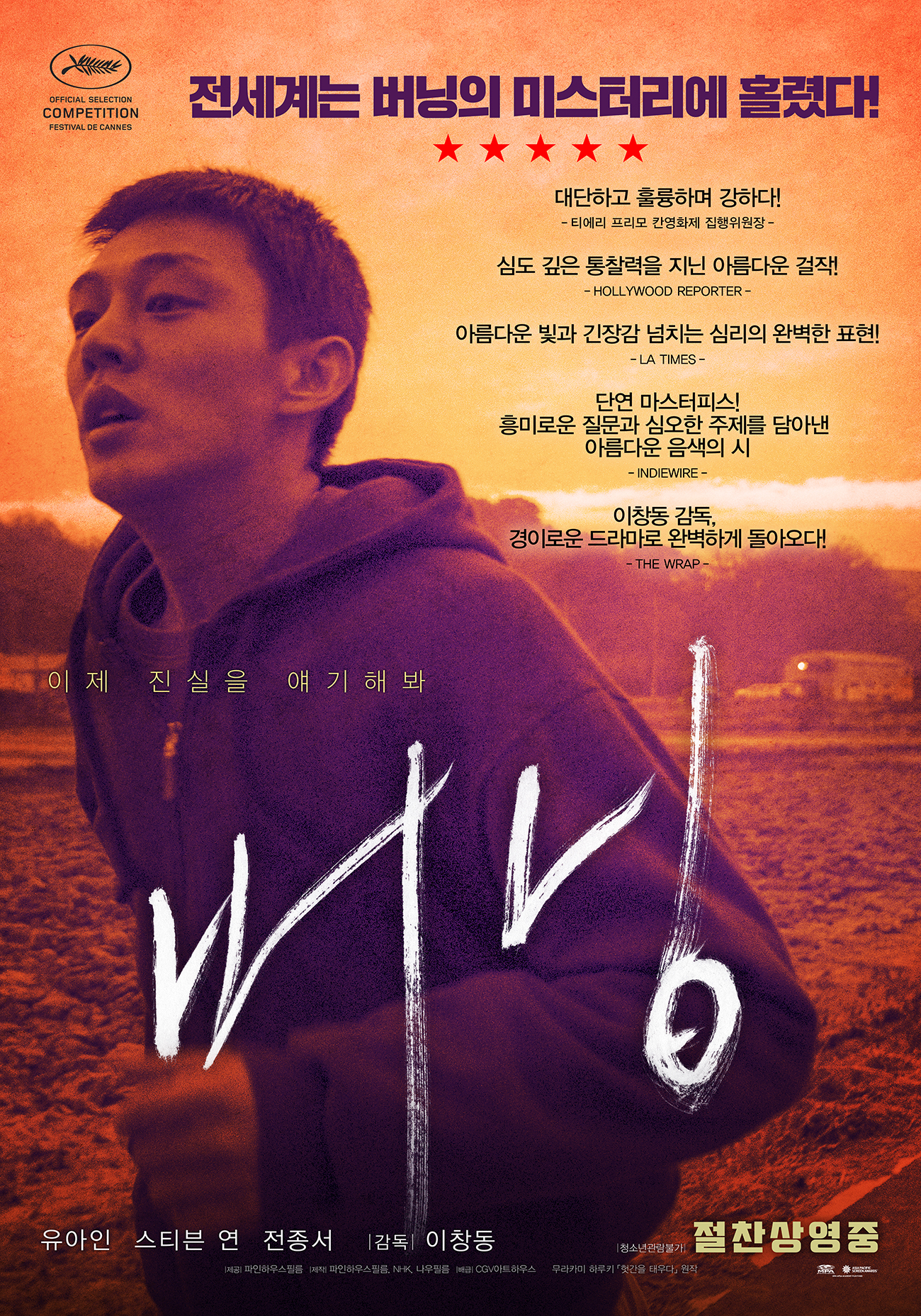 이창동 감독은 노무현 정부에서 문화관광부 장관을 역임했었다. 그 전에는 고등학교 국어선생님이기도 했고, 신춘문예에 당선된 소설가이기도 하다. 그가 무라카미 하루키의 소설, 그것도 단편 ‘헛간을 태우다’를 영화로 만들었다기에 궁금해졌다. 하루키의 오리무중 같은 작품을 장편으로 만들기는 쉬운 일이 아닐 것이다. 확실히 원작소설은 이야기 구조가 너무 짧고, 맥락이 없는 듯하다. 할리우드에서 필립 K. 딕의 단편 하나를 블록버스터로 옮길 때처럼 ‘인상적인 설정’과 ‘기발한 아이디어’만 가져와야 2시간을 채울 수 있을 것 같았다. (영화는 2시간 27분이란다)