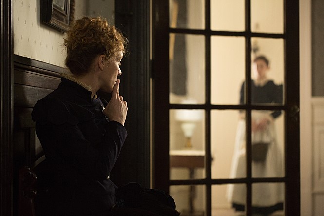 아버지 앤드류 보덴은 여러 사업을 펼쳤고, 부동산 수완도 좋아 꽤 많은 재산을 갖고 있었지만 소박한 집에서 검소한 삶을 살았다. 그가 잔인하게 죽었을 때 남겨진 재산은 30만 달러(요즘 화폐가치로 837만 달러)였다고 위키피디아에는 나와 있다. 정신적으로 불안정해 보이는, 혹은 시대적 상황에 맞지 않게 자의식 강한 리지는 부친과 뾰족하게 충돌한다. 밤이 되자 돈 많고 점잖은, 전형적인 백인 노신사는 하녀 매기의 방을 찾아간다. (성폭행을 암시한다!) 만약, 그것이 살인으로 연결된다면 공통의 분노를 가진 리지와 매기를 보게 되는 것이다. 그리고 놀랍게도 여기에 더해, 만약 리지와 매기가 연민과 동정의 마음을 뛰어넘어 ‘미묘하지만 제어할 수 없는 어떤 불꽃같은 감정’을 갖게 된다면? ‘리지’영화에서 빼놓을 수 없는 ‘레즈비언 드라마’가 더해진 것이다. 이런 참신한(?) 발상은 사건발생 후 한 세기가 지난 뒤 미스터리 작가 에드 맥베인(에반 헌터)이 ‘리지’ 책을 내면서 내놓은 설정이다.