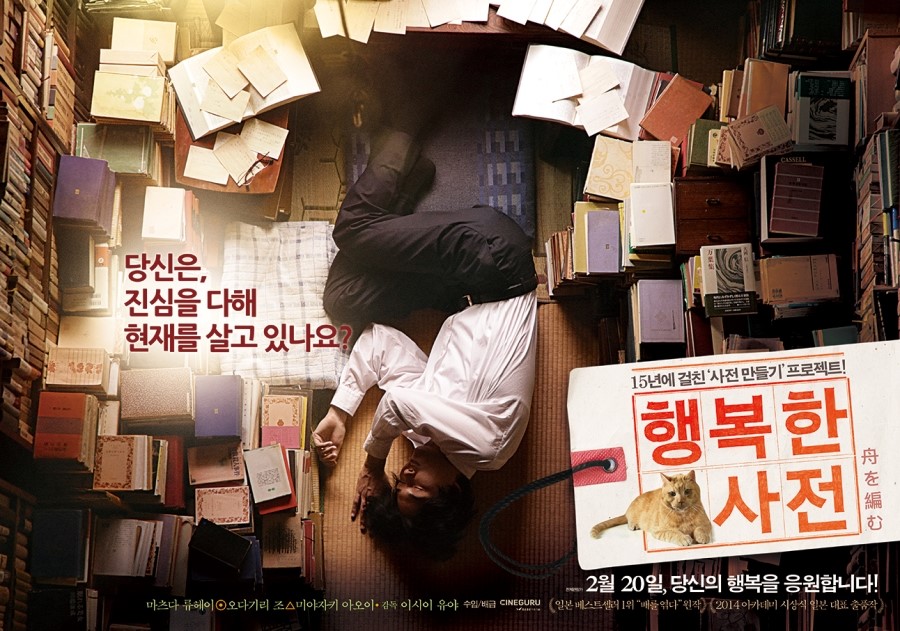 인터넷이 일상화되면서 좋은 영화를 추천할 경우 ‘강추한다’고 한다. ‘강력추천’의 줄임말일 것이다. “변호인 강추!”처럼 쓰인다. ‘렛 잇 고~’ 노래만 흥얼거리고 안 본 사람에게는 “겨울왕국 초강추”라고도 할 것이다. 그런데 ‘개강추’라는 말도 사용된다. 우리나라 말에서 접두사 ‘개-‘가 붙어 좋은 뜻, 귀한 의미로 쓰인 예는 거의 없다. 그런데, 인터넷 세상에서는 ‘개-’가 ‘아주아주’의 의미로 사용된다. (‘캐’‘도 사용된다!) 반려동물 애호자가 많아서 언어의 의미가 바뀐 것일까. 아님 인터넷 세대의 독특한 언어유희 탓일까. 적어도 ’국립국어원‘ 표준국어대사전에는 수록되어있지 않다. 물론 네이버 오픈사전이나 지식인에는 올라있다. 그럼 누가 이런 단어를 찾고(채록), 알맞은 뜻풀이를 하여 사전에 집어넣을까. 작년 부천국제영화제( PiFan)에서 소개되었던 일본영화가 오늘 개봉된다. 아주 흥미로운 영화이다. 일본 서점관계자들이 뽑은 ’일본서점대상‘을 수상한 미우라 시온 작가의 소설 ‘배를 엮다'(舟を編む)라는 작품을 이시이 유야 감독이 동명의 영화로 옮긴 것이다. 우리나라 개봉제목은 ’행복한 사전‘이다. 장인정신이 넘치는 일본의 한 출판사 사전편찬부 사람들의 ‘집념과 끈기의 새 사전 출판기’를 다룬 영화이다. 사전을, 언어를, 사람을, 사랑을 알고 싶다면 이 영화를 보고, 이 원작소설을을 읽고, 이런 연애를 해 보시기를 미리 권하며 영화를 소개한다.
