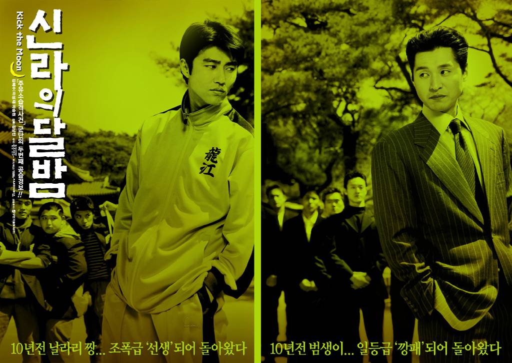 학교 앞 라면집('주섭이네'라는 라면집은 이미 경주의 명물이 되었다고 한다)의 왈가닥 여주인 김혜수는 톡톡 튀는 그의 이미지를 그대로 닮았다. 게다가 김상진 감독은 시종일관 "분위기 잡지 말고 자연스런 연기를 하란 말야"고 요구했다. 아마, <신라의 달밤>이 재미있는 또 하나의 이유는 이들 삼총사 외에 민주란의 남동생 민주섭 역의 이종수 때문인지도 모른다. <간첩 리철진>에서 언제나 짱이 되려고 했던 '신하균'처럼 그는 언제나 노력한다. "20등 안에 들면 조직에 받아주지"라는 박영준의 말에 빠져 죽도록 공부하는 모습은 전형적인 '만화'스타일이다. 그런 만화 스타일은 경주 토착 깡패나 박영준을 잡기 위해 혈안이 된 노형사의 집착에서도 느낄 수 있다. 휘영청 달 밝은 밤에 벌이는 만화같이 황당한 차승원의 와이어 액션 장면 또한 명장면이다. 전체적으로 이 영화는 유승완 감독의 인터넷 영화 <다찌마와 리>가 마치 <친구>를 만난 것 같이 오락물로서는 만점이다.