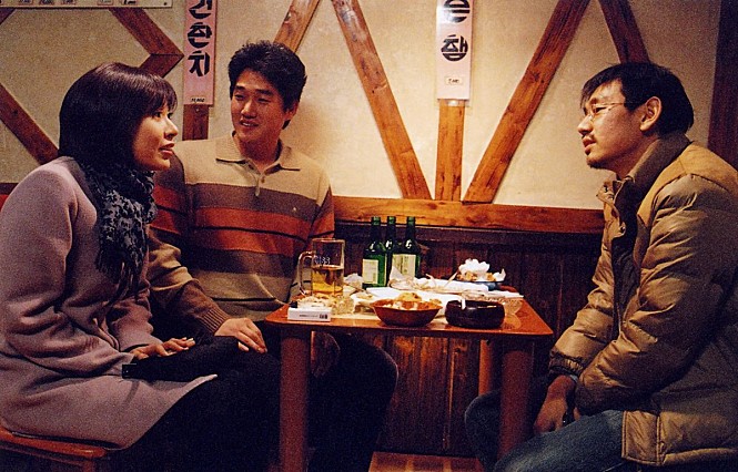 '아니나 다를까' 이번 영화에서도 홍상수 감독은 주인공의 입에 끊임없이 알코올을 들이부으며, '아니나다를까' 여관으로 밀어 넣는다. 누가 먼저고, 누가 뒤인지는 필요 없다. 필름이 끊긴 사람은 여태 무슨 일이 있었는지 긴가민가 할 것이고, 도덕적 후회나 육체적 피곤함보다는 어쨌든 현상유지나 관계접점이 제1순위 목표가 되어버렸을 테니 말이다. 물론 헌준과 문호는 선화가 어떤 여자인지를 알 것이지만 그게 어떤 의미인지는 제대로 받아들일 수 없는 입장이 된다. 관객들은 결코 '성녀'(배창호 감독의 [기쁜 우리 젊은 날]에서의 황신혜 정도?)로 묘사되지 않은 선화에 대해서는 거의 냉정함을 유지하도록 주입받는다. 여자는 '대상'인 동시에 '제3자'가 되어 있고, 두 남자의 절절한 구애만이 남게 된다. 영화는 7년의 세월을 등지고 있다. 7년 전 그랬던 선후배와 여자는 다시 술자리와 여관을 오가며 여전히 잊지 못하고 있는 상대에 몰입한다. 결론은? 결국 술이 모든 것을 인도하고 모든 것을 해결한다.