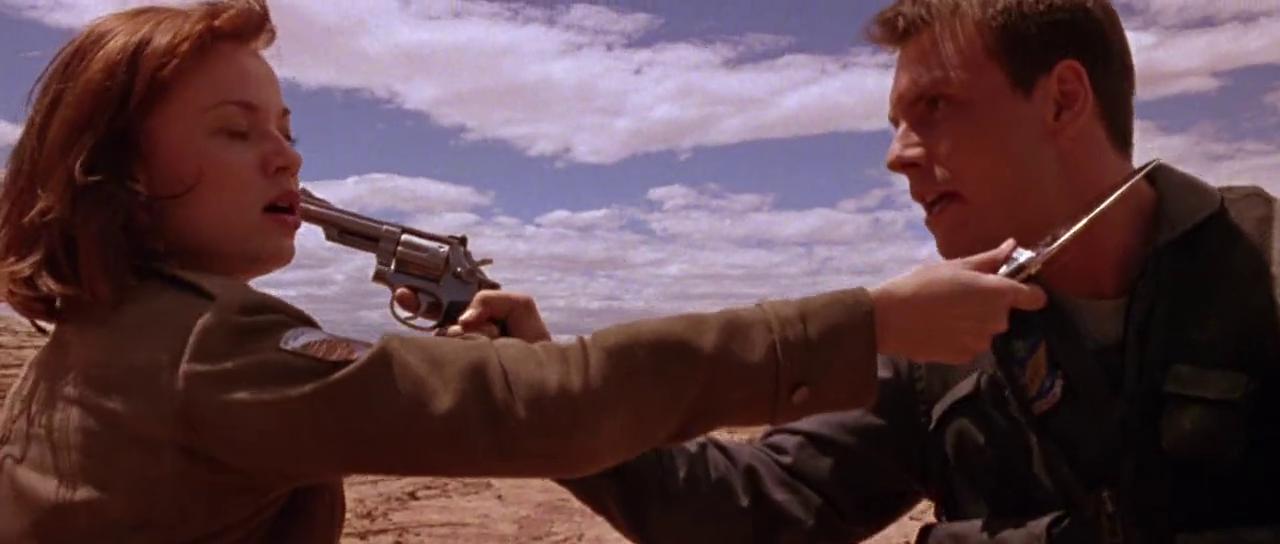 영화의 첫 장면은 권투 시합장면이다. 두 주인공의 심리를 가장 명료하게 보여준다. 존 트라볼타는 이기겠다는 집념과 상대를 꺾어버리겠다는 의지로 철철 넘치는 타입이고, 크리스찬 슬레이트는 왠지 져 주는 맛으로 세상을 살아가는 타입이란 것이다. 그리고, 이들은 곧 스텔스 기를 타고 심야 테스트 출격에 나선다. 핵 미사일을 두 개나 탑재하고 말이다. 그런데 이 존트라볼타는 연거푸 승진에서 고배를 마신 후 자신의 처지에 불만이 이만저만이 아니다.