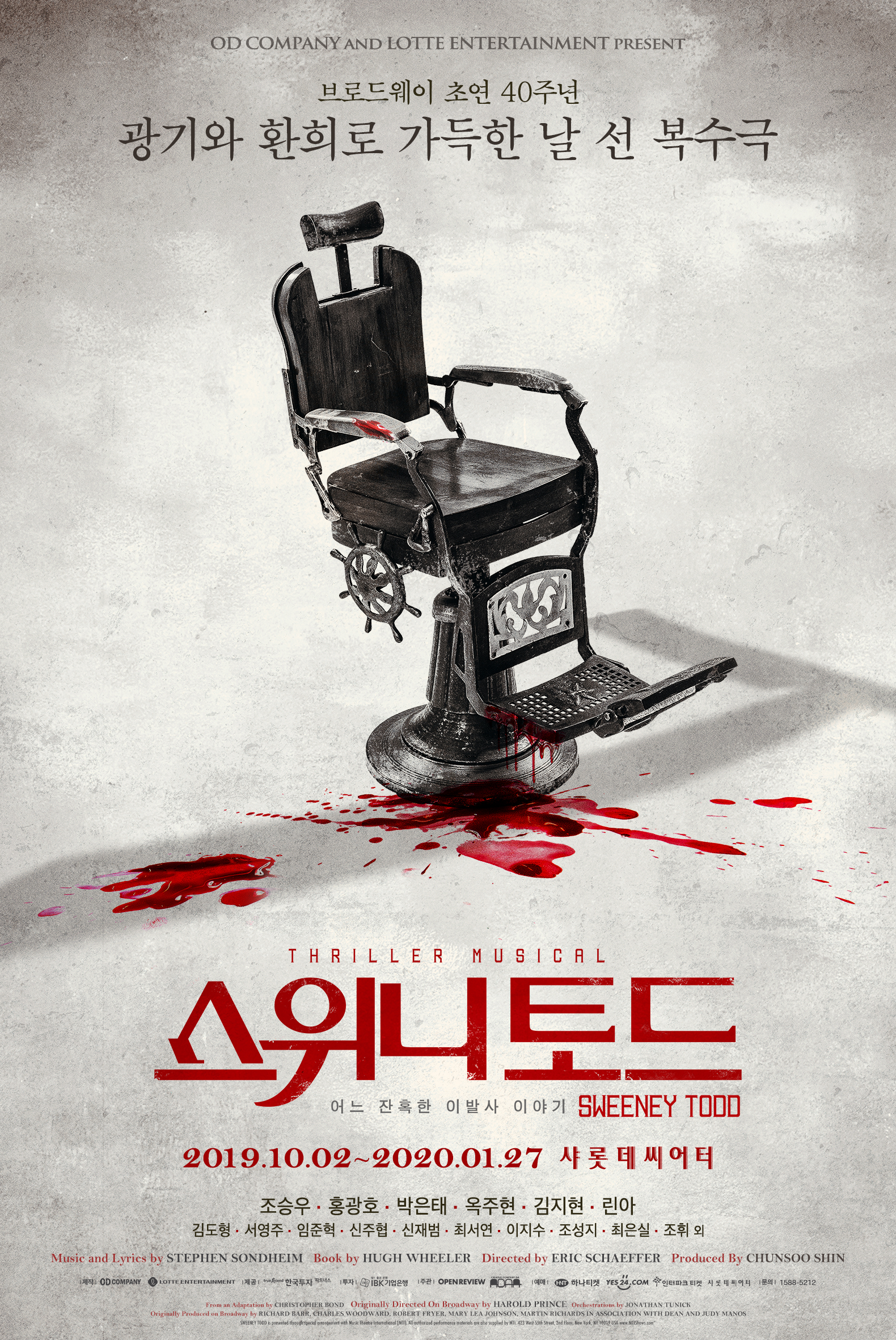 조승우, 홍광호, 박은태(이상 스위니토드), 옥주현, 김지현, 린아(이상 러빗 부인)의 뮤지컬 <스위니 토드>는 내년 1월 27일까지 샤롯데씨어터에서 공연된다. 프로덕션 측은 ‘중학생이상 관람가’로 홍보 중이다. (박재환 2019.10.21)
