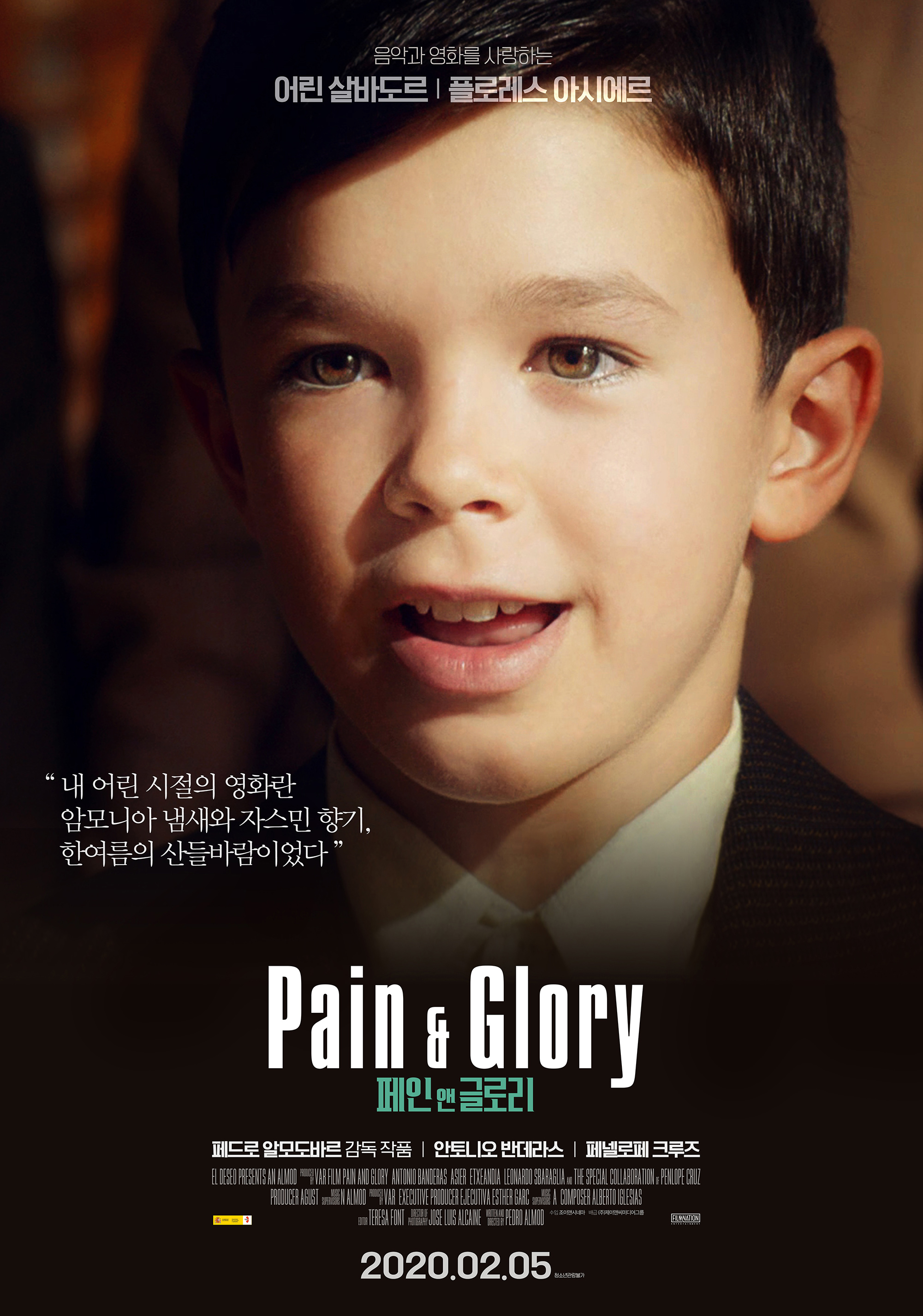 영화 제목 <페인 앤 글로리>는 왕년의 영화감독의 현재이다. 육신은 나이 들어 고통으로 가득하고, 그 고통을 기반으로 한 영광은 찬란하다. 이 영화가 감독의 자전적인 이야기라고 하는데 실제 어디까지가 그러한지는 모르겠다. 어린 시절 한없이 투명하고 섬세한 눈동자와 나이 들어서의 보이는 우수의 눈빛이 삶의 곡절과 예술의 무게를 더하며 이야기에 완전히 빠져들게 만든다.