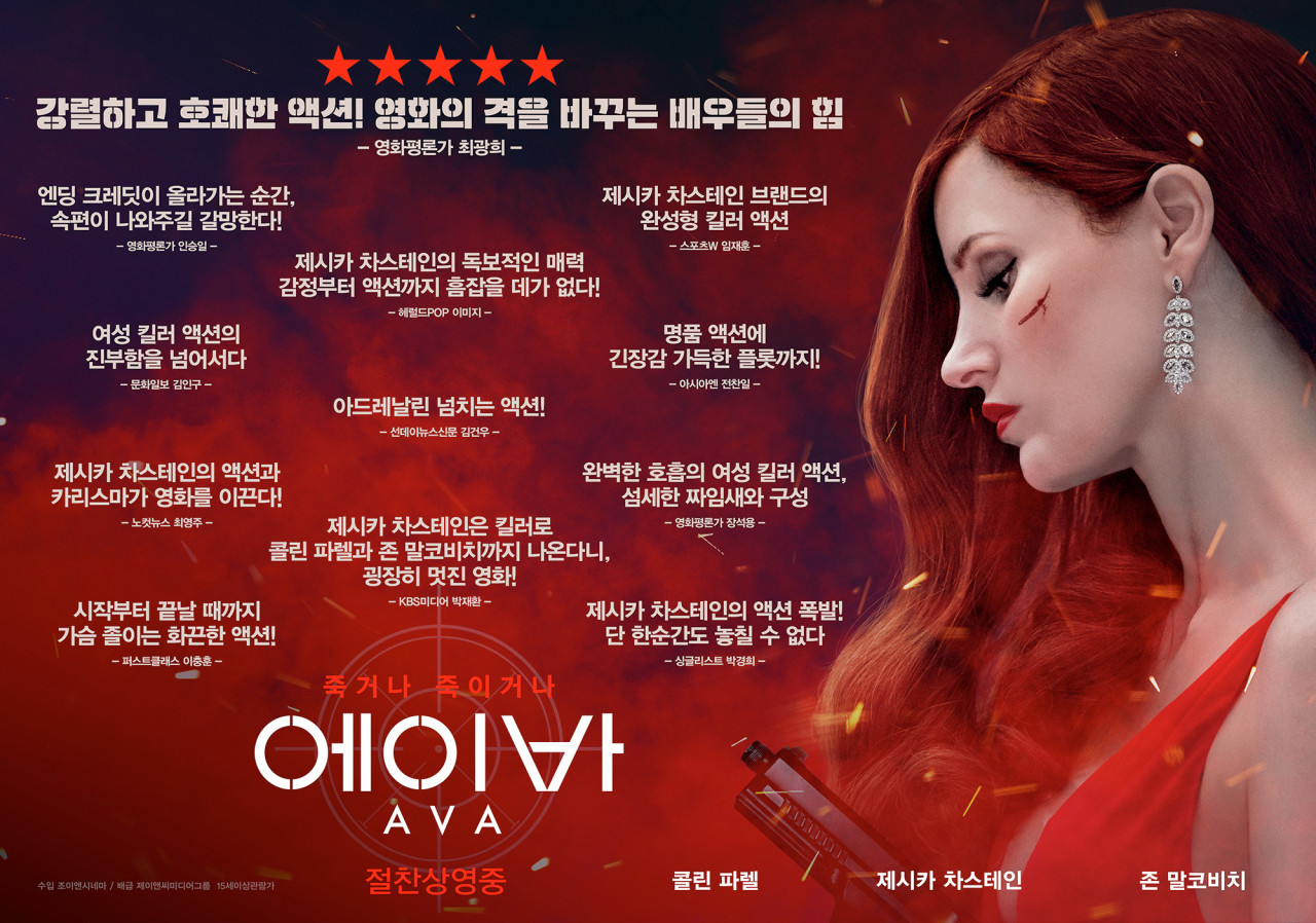 여성 킬러가 매력적으로 등장하는 영화는 꾸준히 있었다. ‘니키타’, ‘솔트’, ‘원티드’, 최근의 ‘아토믹 블로드’나 ‘안나’까지. 그동안 많은 영화에서 여배우의 카리스마를 보여준 제시카 차스테인의 액션활극에 기대를 가질만하다. 그런데, 안타깝게도 <에이바>는 개인적 핸디캡을 가진 여전사의 드라마도, 아프간에서 단련된 액션 전사의 화려함도 못 채운 소극에 머문다.