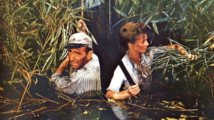때는 1914년. 1차 대전이 발발했을 무렵의 아프리카 동부(탄자니아 쪽이란다)의 밀림 원주민 부락에 백인 여자 로즈(캐서린 헵번)는 열정적인 신앙을 가진 오빠와 함께 선교활동에 여념이 없다. 그런데 어느 날 이 평화로운 곳에 독일군이 쳐들어왔고, 오빠가 숨을 거둔다. 독일군이 부락을 완전히 불태우자 로즈는 아주 가끔 이곳에 우편물을 전달하는 찰리 선장(험프리 보가트)의 작은 발동선-폐선 직전의 증기선인 ‘아프리카의 여왕’에 올라 탈출한다. 캐서린은 오직 오빠의 복수를 꿈꾼다. 어떻게? ‘아프리카의 여왕’에 폭탄(수뢰)을 달고 커다란 호수를 차지한 독일 함선 루이자호를 침몰시키겠다는 것이다. 깐깐한 도덕주의자 로즈와 어쩌다 독일과의 싸움에 말려든 찰리는 티카타카를 펼치며 급류와 정글, 모기떼와 거머리의 습격을 뚫고 강물을 내려온다. 죽을 고비를 여러 차례 넘기고 호수에 도착하고, 마침내 독일 전함과 마주한다.