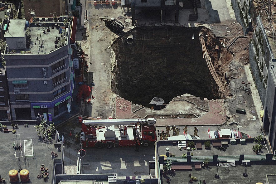 비가 많이 온 뒤 땅패임이나 땅꺼짐 현상은 일반적이다. 그런데, 언젠가부터 뉴스에서는 끔찍한 지구 지표면의 변화를 보여주는 현상이 등장했다. ‘싱크홀’ 현상이다. 국립국어원에선 ‘땅꺼짐’이라고 제시한다. 과학적으로는 지하암석이 용해되거나 기존의 동굴이 붕괴되어 생기는 현상으로, 특히 안의 지하수가 빠지면서 땅굴의 천장이 그 무게를 견디지 못해서 땅이 꺼지게 된다고 설명한다. 지하수 고갈, 세일가스 시추 증대 등의 이유를 덧붙이기도 한다. 그동안 뉴스를 통해 본 모습은 직경 수 미터, 때로는 수십 미터이고 깊이도 그 정도에 달한다. 자동차 몇 대가 땅 속으로 빨려 들어가거나, 꺼져버린 도로 가장자리에 아슬아슬하게 걸린 모습을 봤을 것이다. 이런 재난상황을 영화인이 그냥 넘어가긴 힘들었을 것 같다. 상상의 나래를 편다. 싱크홀이 최대규모로 벌어진다며? 외계인의 습격도 아니고, 도시개발자의 야욕도 아니라 그냥 내가 사는 우리 집이 어느 날 땅 밑으로 수백 미터 꺼져버린다면? 영화 [싱크홀]이 그런 상황을 그린다.