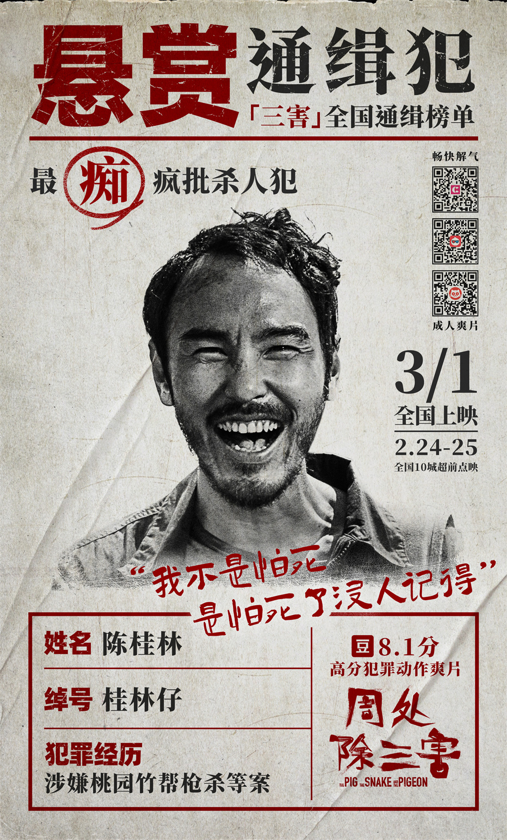▶돼지와 뱀과 비둘기 (원제:周處除三害/The Pig, The Snake and The Pigeon) ▶감독/각본:황정보(黃精甫) ▶출연:완경천(阮經天), 원부화(袁富華), 진이문(陳以文), 왕정(王淨), 이이인(李李仁), 사경란(謝瓊煖) ▶넷플릭스 2024년 3월 일공개 ▶134분