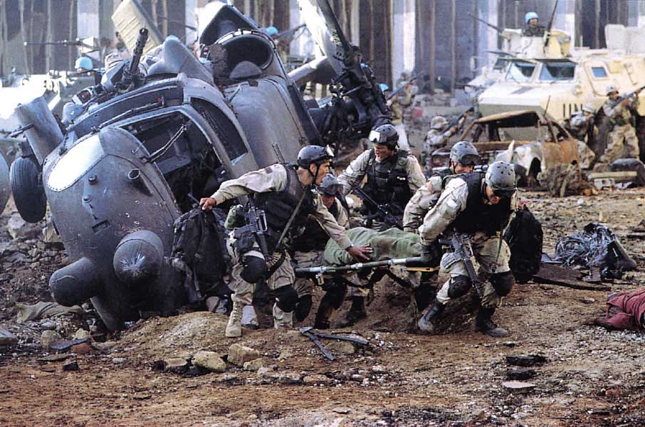 소말리아는 아프리카 동북부에 위치한 인구 700만 정도의 나라이다. 90년 대초 계속되는 기근과 종족분쟁, 쿠테타 등으로 100만 명이 죽어나간 곳이기도 하다. 아프리카 대부분의 국가들이 그렇듯이 이곳에는 서구에서 군사교육을 받은 몇몇 군장성들이 정권을 장악하고 철권통치 군벌정치를 펴는 것이다. 소말리아도 마찬가지이다. 이탈리아의 식민지 국가였던 소말리아에서도 몇차례 쿠테타가 거듭되고 정권을 잡은 자, 아니 정확히는 소말리아의 가장 많은 지역을 군림하게 된 자는 모하메드 파라 아이디드 (Mohammed Farrah Aidid)이다. 소말리아에서 수백 만명이 기근에 죽어가자 정의의 UN, 평화유지군과 너무나 인간적인 서구의 평화단체는 벌떼처럼 일어나 구호 활동을 펼치기 시작한다. 유엔 소말리아평화유지군(UNOSOMⅡ)에는 우리나라 유엔 평화유지활동(PKO) 공병부대 등이 포함되어 있다. 미군만 가 있는 것이 아니고 파키스탄 등 모두 28개 국이 평화의 이름으로, 그리고 소말리아 평화성립 이후의 과실을 따먹기 위해 나가있다. (우리나라만 평화를 위해 나가 있다고 생각한다면 그건 참으로 우물 안 개구리 같은 사고방식이다!) 이 영화 첫 장면에서는 아주 간단하게 소말리아의 현실이 '인상적으로' 묘사된다. 미군 헬기가 공중에서 엄호하고 있는 가운데 유엔 식량구호 트럭이 소말리아 민중들에게 쌀을 실어나른다. 수백 명이 트럭에 몰려들고 쌀을 배급/혹은 강탈하러하자, 갑자기 일단의 무장한 트럭이 나타나 민간인에게 총탄을 퍼붓기 시작한다. "이 식량은 아이디드 사령관님 것이다."라고 선포한다. 공중에서 헬리콥터도 이 상황을 처음부터 끝까지 지켜보는 미군의 대화. "맙소사. 저놈들이 민간인을 학살하고 있어!" 사령부와 무전으로 통화한다. 하지만 사령부의 명령은 간단하다. "우리가 총격받았어? 총격받지 않은 이상 절대 쏘지 마라!"
