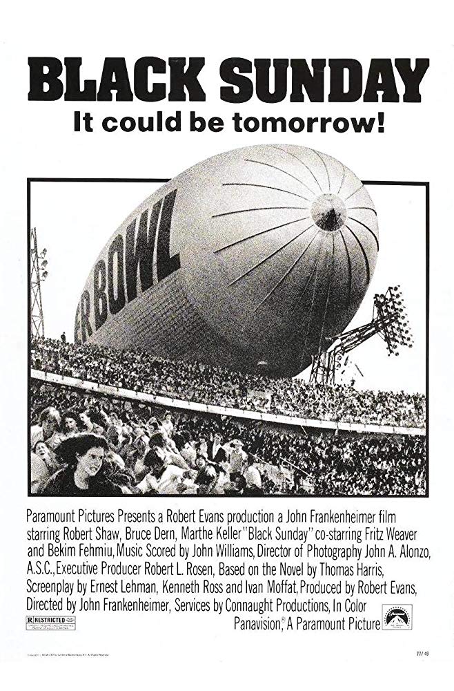 (박재환 2001.9.14.) 엽기살인마 한니발 렉터를 주인공으로한 일련의 베스트셀러 소설 <양들의 침묵>, <한니발>의 작가 토마스 해리스의 첫 번 째 작품은 테러리스트의 거대한 음모를 그린 <블랙 썬데이>라는 작품이다. 이 작품에서는 테러리스트들이 폭탄을 잔뜩 실은 대형비행선을 슈퍼볼 결승전이 열리는 뉴올린즈의 거대한 스타디움을 가득 메운 8만여 관객을 향해 돌진한다. 물론, 관객 중에는 미합중국 대통령도 포함되어 있고 말이다. 이 소설은 곧바로 영화로 옮겨졌다. 감독은 존 프랑켄하이머. <죠스>에서 백상어 사냥에 혈안이 되었던 로버트 쇼가 테러리스트를 뒤쫓는 이스라엘 요원으로 등장한다.