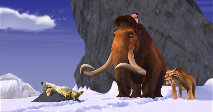이 대이동의 와중에 낙오된 생물체가 있었으니 바로 맘모스 한 마리와 검치호랑이 한 놈, 나무늘보 한 마리, 다람쥐 한 놈, 그리고 어린 아기 하나이다. 맘모스는 코끼리같이 생겼을 것이고, 검치호랑이는 이제는 멸종한 호랑이의 일종으로 화석으로 보자면 어금니가 20센티나 튀어나온 흉악한 놈이다. 검치호랑이는 무리를 지어 초식동물 맘모스를 잡아먹기도 했을 것이란다. 나무늘보는 이름만큼 한가하고 게으르고 대책 없는 놈이다.