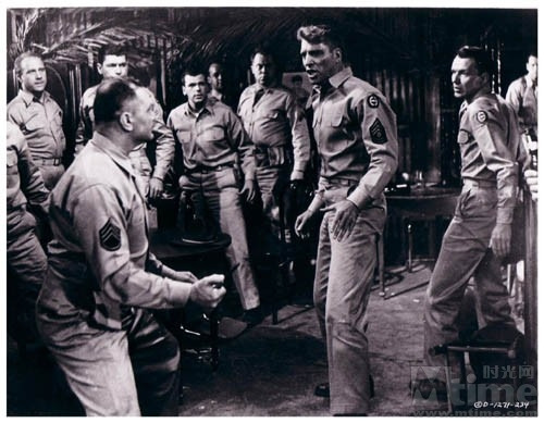 아마, 군대 갔다온 사람은 바로 느끼겠지만 (물론, 지금은 어떻게 바뀌었는지 모른다!) 군대가 이루 말할 수 업이 편하기만 하면 어떤 부조리가 생기는지 알 것이다. 그 남는 시간에 쓸데없이 고참이 하급자를 못 살게 군다는 것이다. 이 영화에서는 그러한 부정적 군대가 정직하게 그려진다. 이등병 '프루'는 왕년의 영내 챔프. 하지만 복싱을 하다 상대의 눈을 멀게한 후 두 번 다시 글러브를 끼지 않겠다고 다짐한다. 하지만 왕년의 주먹왕을 부른 부대 지휘관인 홈스 대위는 그에게 권투를 하라고 강압한다. 시합에 나가 우승을 하면 자기 부대 점수가 올라가고 자신은 승진할 것이니 말이다. (군대에는 그런 면이 있다! 사격 잘한다고 휴가 보내주고, 전투화 잘 닦았다고 특박 보내주고, 모포 잘 개어놓았다고 상 주는 게 평화시의 군대모습이다! 지금은 어떤지 모르겠지만.) 자신에게 굳은 맹세를 한 프루에게 돌아오는 것은 군대 내에서 이루어지는 합법적 얼차례와 군기잡기의 연속이다. (어떤 식으로 한 영혼을 갉아먹는지는 이야기하지 않겠다. 가장 비열하고 가장 비인간적으로 하급자를 다룬다) 그런 프루에게 단 하나의 전우가 있었다면 마지오(프랭크 시나트라). 마지오는 프루의 '진짜 남자다움'에 친밀감을 느끼고 주말이면 함께 술 마시러 영내를 나간다.